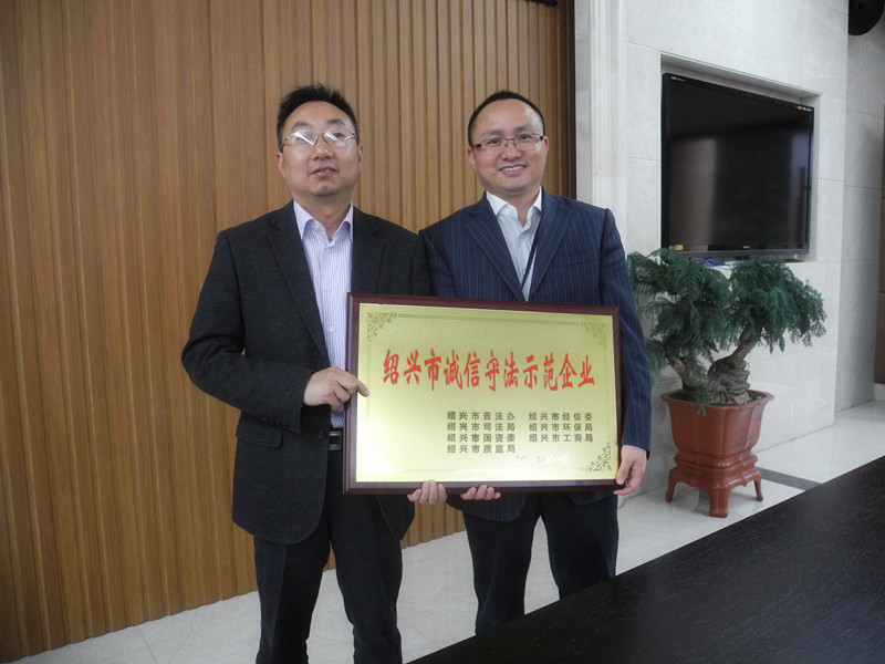 公司一直坚持忠实守信,,,,,,依法谋划原则,,,,,,经绍兴市普法办、绍兴市经信委、绍兴市司法局、绍兴市环保局、绍兴市国资委、绍兴市工商局、绍兴市质监局等7家部分团结评审,,,,,,2013年11月被评定为绍兴市“诚信遵法树模企业”。。。。。。